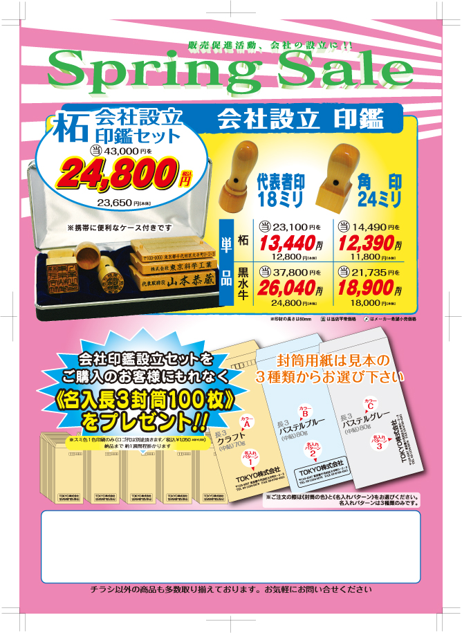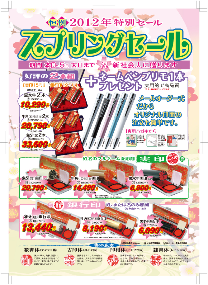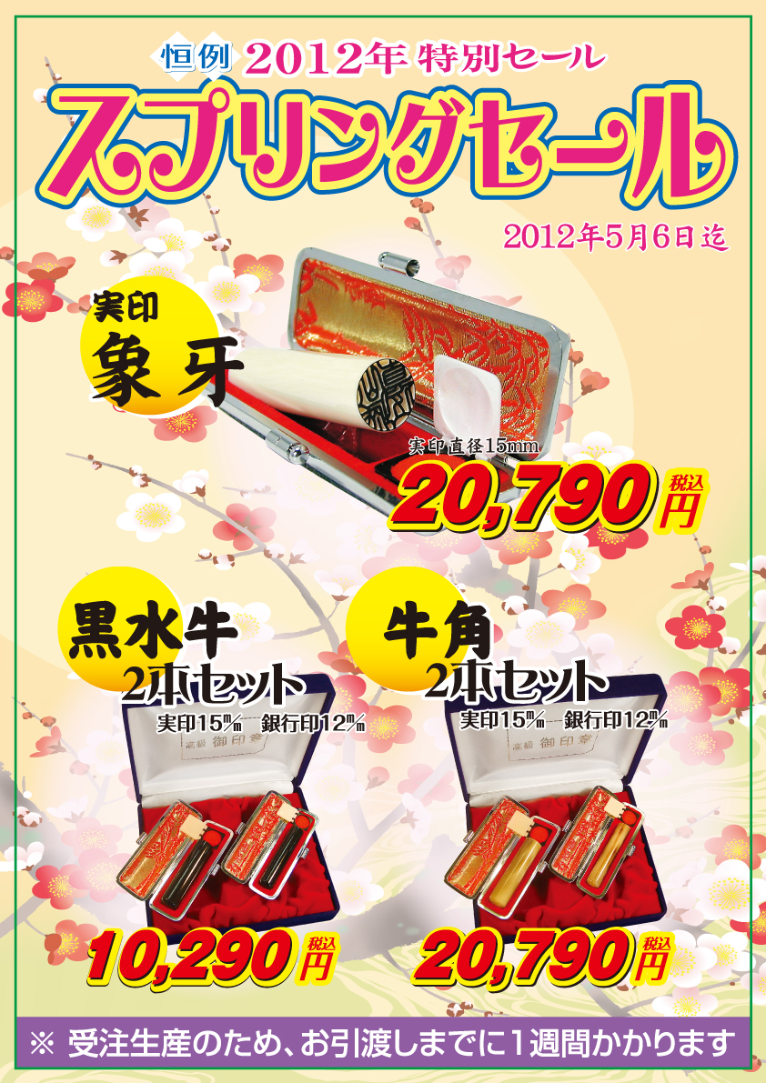 毎年店頭で恒例の春の「実印・銀行印・会社設立印」のスプリングセールです。 当店の印鑑は熟練職人が繊細かつ丁寧に、唯一無二の印鑑をお作り致しております。 画像をクリックすると大きくなります。お問い合わせはこちらまで。