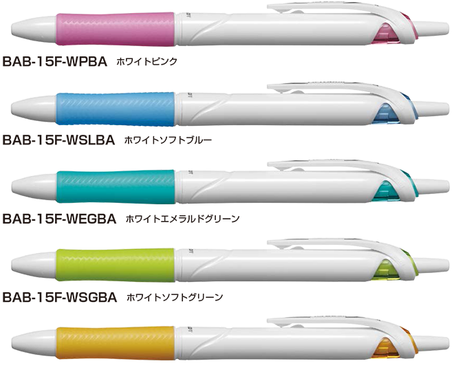 ボディは5色ございます。白軸ですのでデザインが美しく映えます。